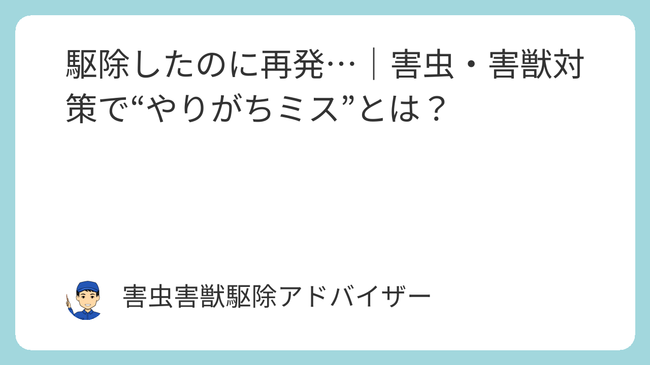 再発の原因は「卵・幼虫・巣の取り残し」「侵入口の未封鎖」が多いです。とくに害獣は一度住みつくと“戻り癖”がつくため、再発防止の消毒や封鎖作業が抜けていると高確率で戻ってきます。